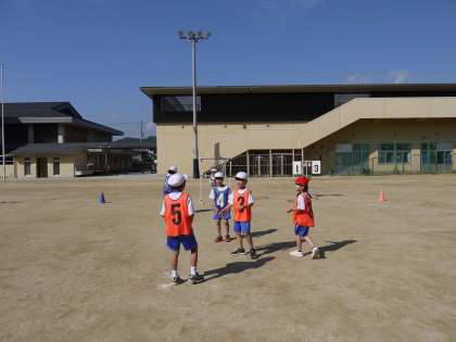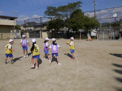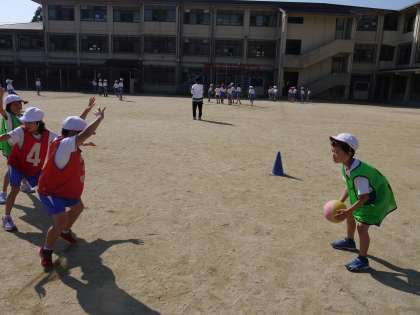 体育科の学習では「パスゲーム」に取り組んでいます。パスをつないでゴールを目指します。味方がボールを持ったら、ゴールに向かって走り、パスを受け取ります。「今日は素早くパスが出来たからシュートを決められました。」とうまくいったことを振り返っていました。