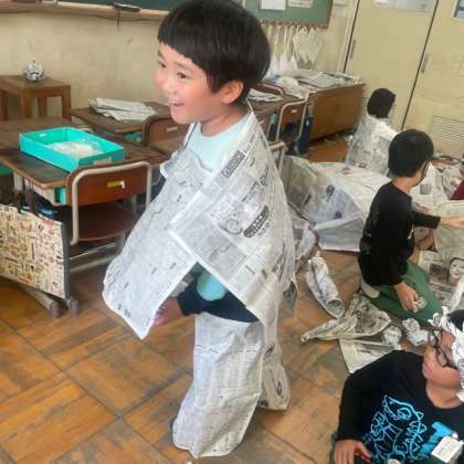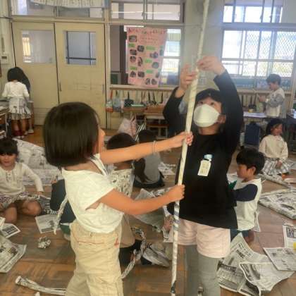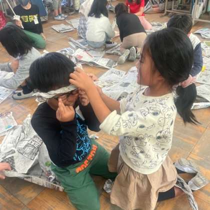 新聞紙にからだ全体で触れながら、思いついたことをあらわしました。ちぎったり、まるめたり、くしゅくしゅにしてみたり…アイディアがどんどん広がりました。新聞紙でこんなに楽しいものが作れるなんて!と感動している様子でした。