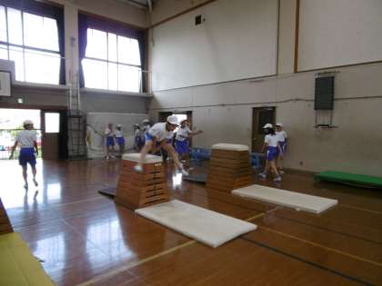 体育科「跳び箱」の学習の様子です。1年ぶりの跳び箱の学習です。準備も、自分たちで声をかけ合いながら進めています。自分のめあてが達成できるよう、一生懸命に取り組む姿がすてきです。