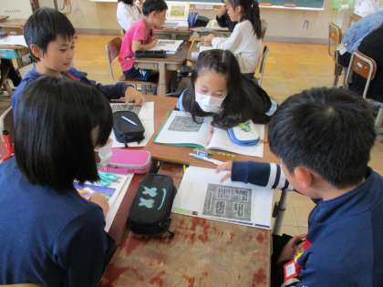 子どもたちは「花の咲いている数を数えたらいいんじゃない?」「重ねてみたら?」「マスを数える?」など、班で話し合いながら1番広い花だんはどれなのかを考えていました。