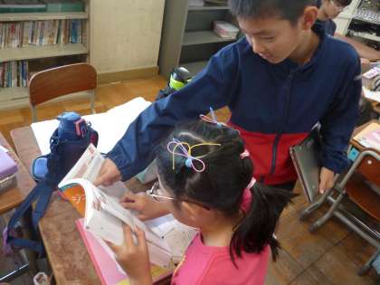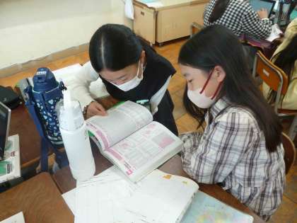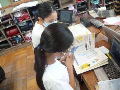国語の学習で、意見文を書く学習をしています。今日は統計資料の読み方を確認した後、自分の考えに合う資料を集めました。本やインターネットを活用していました。