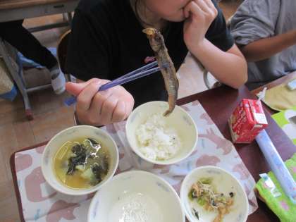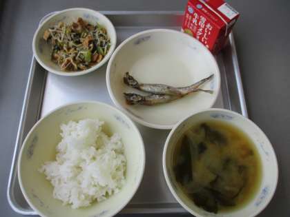 給食にししゃもが出ました。子どもたちは「卵がたくさん入っている!」「頭から食べる?しっぽから食べる?」など言いながら食べていました。