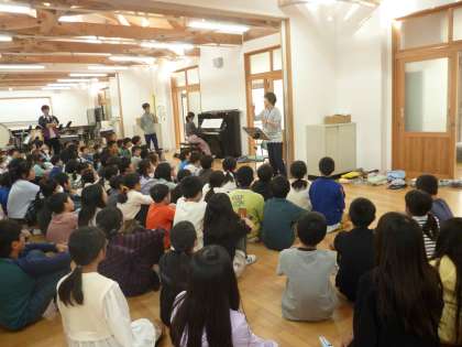 音楽発表会で演奏する曲の練習をしています。今日は初めて、学年全員で集まって練習しました。自分の音だけでなく、友達の演奏の音を聞きながら演奏したり歌ったりしていました。