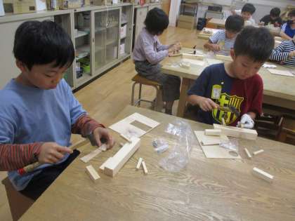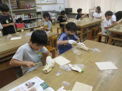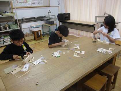 図工室に行って、金づちでくぎをとんとん打って立体作品を作っています。初めて学習で使う金づちの使い方をみんなで確認してから、くぎ打ちをしました。自分の作りたいものをイメージして、工夫しながらくぎを打ちました。くぎがまっすぐ打てず苦戦する姿も見られましたが、少しずつ上達して頑張っていました。
