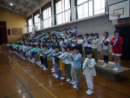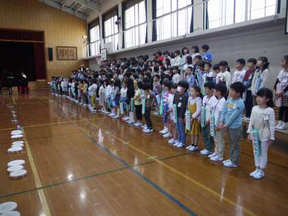 体育館での音楽発表会の練習が始まっています。クラスごとに並んでみて、一通り流してみました。「まだ虫の声の鍵盤ハーモニカがうまく弾けないから練習するね。」「手話をしながらでもうまく歌えるようになってきたよ。」と振り返り、次への目標をもっていました。