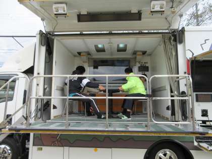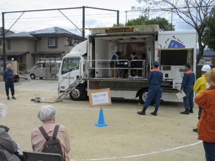 起震車にのって震度7の地震を体験しました。体のコントロールが効かなくなり、こけないように体を支えるだけでいっぱいいっぱいでした。