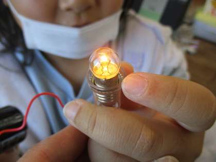 豆電球に明かりをつける実験中,フィラメントの美しさについて話す子がちらほら見られました。
