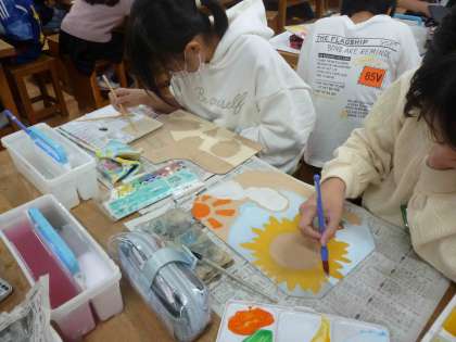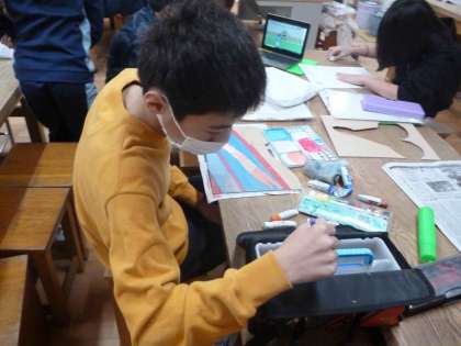 図画工作の学習で電動のこぎりを使った学習をしています。初めて電動のこぎりを使うので、緊張している様子でした。板を切った後は、色を塗りました。丁寧に作品を仕上げようとしていました。もうすぐ完成する予定です。