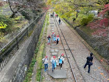 蹴上インクラインには、長い線路があります。子どもたちは足元に気をつけながら歩いていました。天気も良く、紅葉も楽しみながら琵琶湖疏水の学習をしていました。
