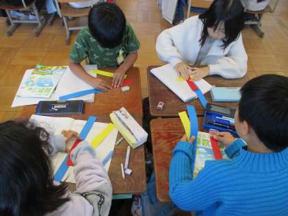 いろいろな長さのテープを比べながら,あまりの長さの表し方について考えました。