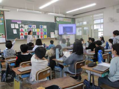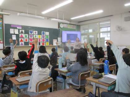 外国語活動の学習では、「What do you want?」という学習で、色と形を英語で言う学習を進めています。これから「What do you want?」という文章を使って、欲しい色や形、数を聞き合い、カードづくりを進めていこうと思っています。