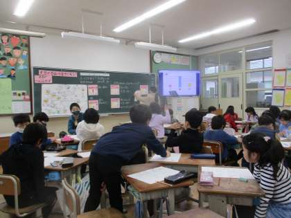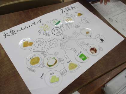 今日は栄養教諭の先生に「大豆」のことについて授業して頂きました。国語科で「すがたをかえる大豆」をして、大豆がいろいろな食品に姿を変えていることを学び、今日の授業で大豆の栄養素や給食にはたくさん大豆にかかわる食品が使われていることを学習しました。大豆の栄養がたくさんあることにとても驚いていました。