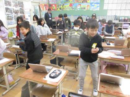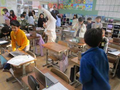 今日はプログラミングの学習で「ループ」の学習をしました。繰り返しのパターンを見つけたり、繰り返しのルールや動きを決めて踊ったりして楽しみながらプログラミングの基礎を学習しました。