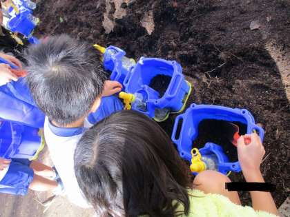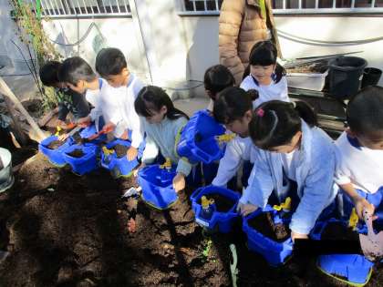 生活科の時間に、チューリップの球根を植えました。土をふわふわにして、お布団をかけるように優しく土をかぶせました。2年生になったとき、色とりどりのチューリップが、みんなを出迎えてくれるのが、楽しみですね。