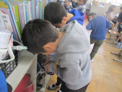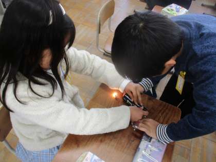 理科の「電気の通り道」の学習では、身近にあるものが電気を通すのか、電気を通さないのかを確かめました。水筒や名札、ランドセルなどを導線につなぎ、回路を作ってたしかめました。