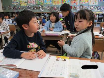 国語科の時間に、友達が今一番楽しいことをインタビューして、みんなに知らせる学習をしました。インタビューやメモの仕方学んだり、「いつ」「だれと」などの質問する言葉を出し合ったりして、インタビューしました。相手の話をうなずきながらしっかりと聞いてメモをし、そのメモをもとに紹介文を書きました。友達が楽しんでいることを知り、喜んだり、驚いたりしている様子でした。