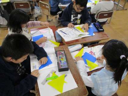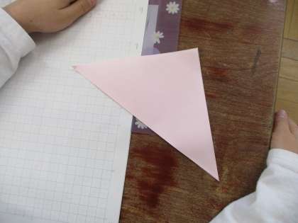 折り紙を使って,正三角形や二等辺三角形をつくる活動にチャレンジしました。