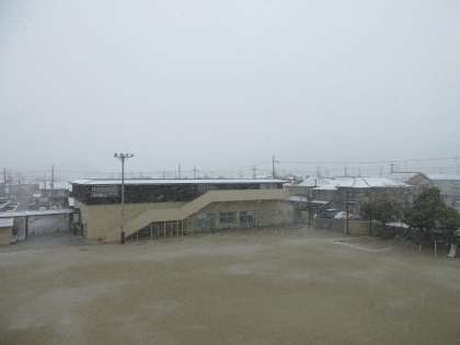 屋根や運動場に雪が積もり、