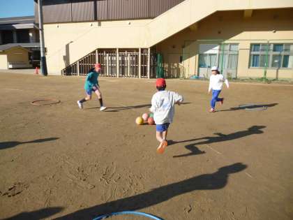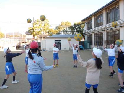 体育の学習で体ほぐし運動をしています。走ったりボールを使ったりと様々な活動を通して体を動かす楽しさを知ってもらえたらと思っています。