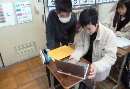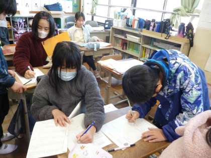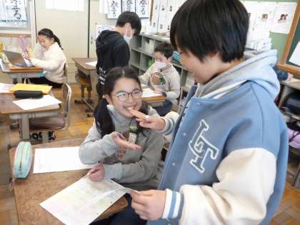 外国語の学習で、物の値段をたずねたり注文の仕方を学習したりしています。今日は、自分で作成したメニューを基に友達と英語でやり取りをしました。英語で話すのが難しいところもあったようですが、楽しみながら学習をしていました。