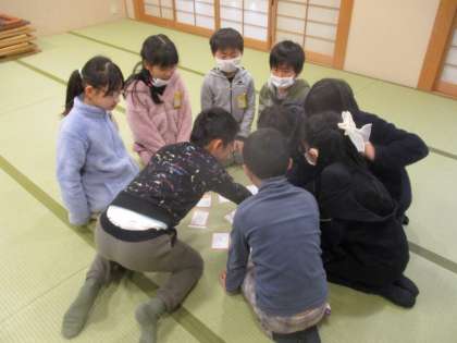国語科の学習でかるたづくりをしました。漢字の「音読み」と「訓読み」を両方使ってリズムの良いかるたを作り、全員分を合わせてかるた大会を開きました。「音楽だ 音をならして いい音色」と同じ漢字を3つ使っている子もいて、みんな工夫して作っていました。