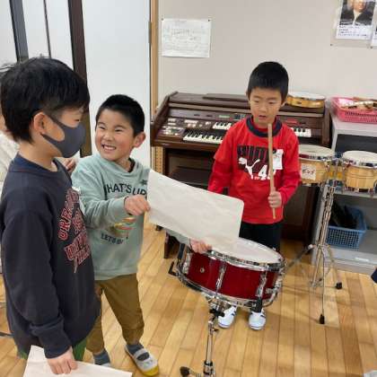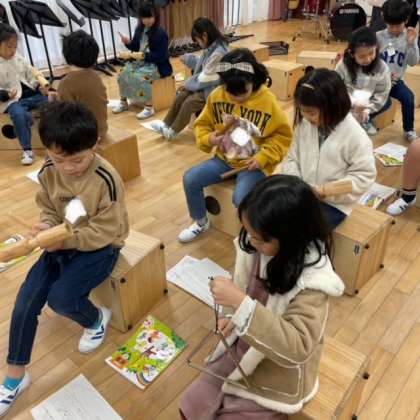 音楽科では、打楽器の音の出し方を工夫しながらリズムを打つ学習をしています。今日は音楽室でクラベスやウッドブロック、すずなど様々な楽器を使って呼びかける役とこたえる役になって音遊びをしました。「呼びかける役とこたえる役を交代してやってみよう」「リズムの順番を変えてみたよ」と、体で拍を感じながら楽器でおはなしすることを楽しんでいました。