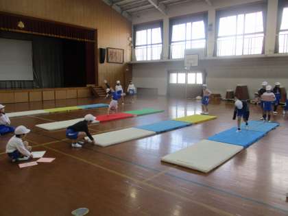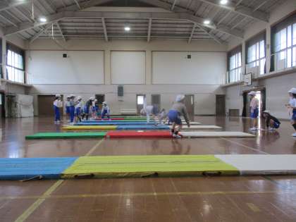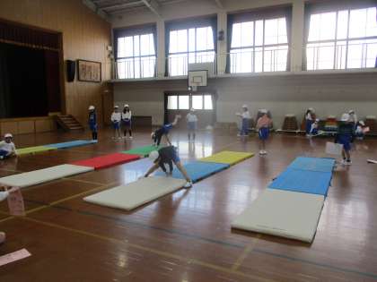体育科の「マット運動」では、自分のできる技を組み合わせて連続技に挑戦しました。基本的な前転や後転を組み合わせたり、ロンダートや倒立前転など少し難易度の高い技を組み合わせたりしました。