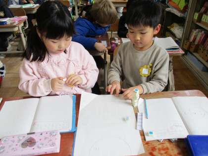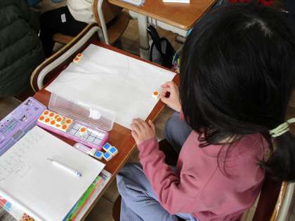 算数の時間に「大きいかず」の学習をしました。数図ブロックを使って、点数くらべをしました。10このブロックが10点、1点、0点の範囲にいくつ入るかを競い、何点入ったか計算してノートに書きました。