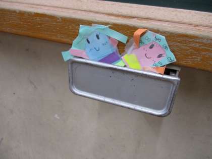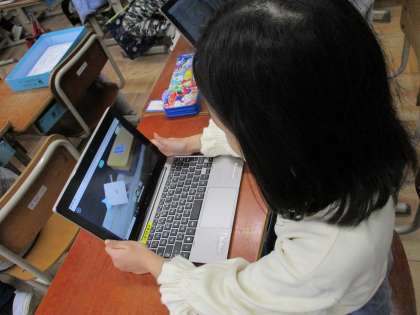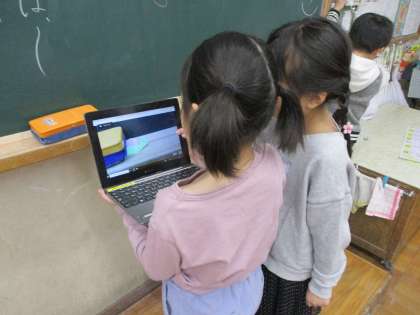図画工作科の時間に「すきまちゃんのすきなすきま」の学習をしました。好きな色の画用紙を使い、思い思いのすきまちゃんを作りました。すきまを見つけて、すきまちゃんを隠すと、タブレット端末で撮影しました。みんなの隠したすきまちゃんを、みんなで見合って楽しみました。
