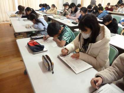 2時間目は、実際に出版された新聞を読んで見出しをつけました。記事の中からキーワードを見つけ出し、読者の目を引く見出しを考えていました。