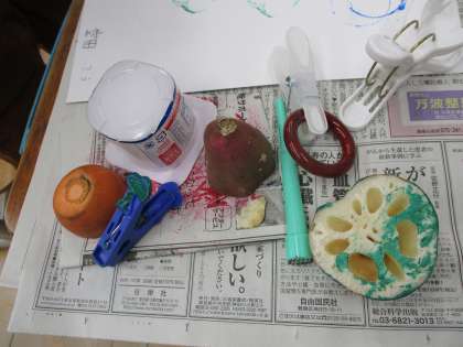 図画工作科の時間に「うつしたかたちから」の学習をしました。スタンプのように押すと、面白そうな形だと思うものを持ち寄って、絵の具の色も選びながら楽しんでいました。面白い形ができると、友達と見せ合いながら押していました。