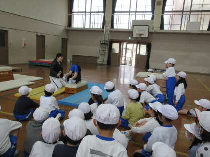 開脚とびがだんだん上手に跳べるようになり、自分のめあてに合った高さに挑戦していました。また、2年生の新しい技・前転がりに挑戦する子もいます。友達がするのを見たり、何度も繰り返し練習したりして、少しずつコツがつかんでほしいと思います。