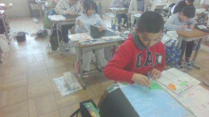図画工作科「ほり進めて刷り重ねて」の学習では、一版多色版画に取り組んでいます。「輝いている自分」をテーマに、得意なことやがんばっていること、好きなことをしている自分を表しています。版は線彫りでほり進めてましたが、4年生で学習したことをいかして、丁寧に線をほり進めることができました。絵の具を使って刷る学習は初めてで、水と絵の具の割合や黒の紙に映える色づくりなど、「難しい!」と苦労しながらも、工夫をして丁寧に進めています。今回の版画の作品は、2月の作品展で展示予定です。