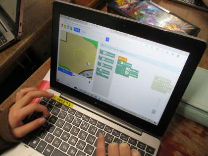 ブロック型プログラミングツールを使って,多角形の辺にいるロボットを動かすプログラムを考えました。