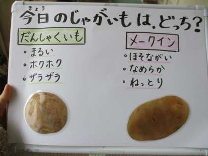 今日の給食のじゃがいもは、舌触りがなめらがでねっとりとした食感の「メークイン」か、舌触りはザラザラでホクホクとした食感の「だんしゃくいも」のどちらだったでしょうか?