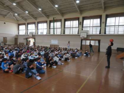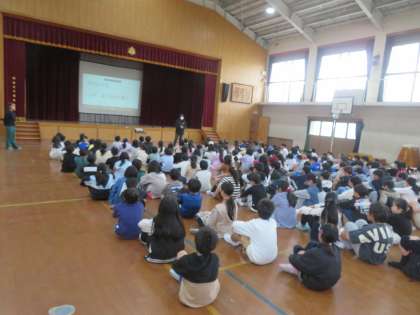 3時間目に学年集会行いました。担任の先生の自己紹介と学年目標、学校のルールについて聞きました。今年度の5年生の学年目標は「ONE TEAM KTF 〜そこにあいはあるんか?〜」です。KTFは「Be kind」「Let's try」「Best friend」のそれぞれ一文字を取った合言葉です。