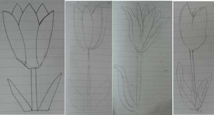 ためしに、チューリップの花を描いてみると、花びらの形や数、花の中心部の様子、葉の形や大きさ、数など分からないことがいろいろあることに気が付きました。
