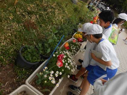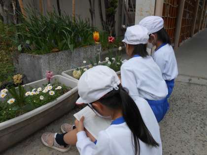 理科「生き物をさがそう」では、中庭に生き物をさがしに行きました。「同じチューリップでも、においが違う!」と、子どもたちは生き物を見つけ、じっくり観察していました。