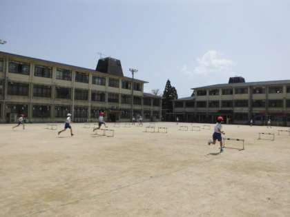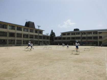 6年生最初の体育科の学習はハードル走です。目標タイムに近づくよう、自分に合うインターバルを見つけ、足の上げ方や姿勢を工夫して取り組んでいます。