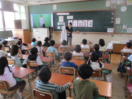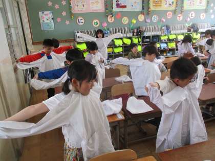初めての給食に向けて栄養教諭の先生から給食当番の仕事や食べ方、エプロンの準備・片付けの仕方の話を聞きました。子どもたちはエプロンのたたみうたに合わせて上手にエプロンをたたんでいました。昨日から当番の仕事も始まりましたが、ぱんだグループのみんなは少しずつ覚えながら頑張っています。