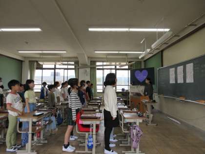 4年生になって初めての音楽の学習をしました。校歌の歌い方の学習をしました。何度も歌っていますが、口の開け方や声の出し方を確認してから歌うと、とても美しい歌声が響き渡りました。