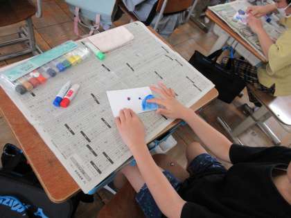 図画工作科で「色合いひびき合い」の学習をしました。絵具を紙に直接つけて、指で混ぜ、色の混ざり方や広がり方を楽しみました。水の入れ方を変えるだけで、色の感じも随分変わることに気付いている子が多かったです。作品を教室に掲示していますので、参観日で見てください。