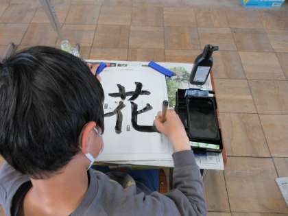 書写の学習で、点画の書き方に気をつけて「花」という字を書きました。何度も練習し、清書では美しく書く子が多かったです。