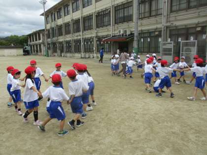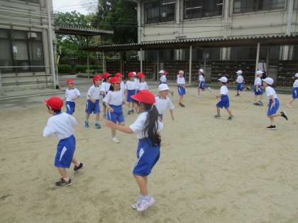 体育科の学習では、からだほぐしの運動をしています。今日は「だるまさんがころんだ」「まねっこ歩き」「かごめかごめ」をしました。まねっこ歩きでは先頭の人の真似を後ろの人がして歩き回りました。跳ねながら歩いたり、ジグザグに歩いたりと工夫しながらおもしろく歩いていました。
