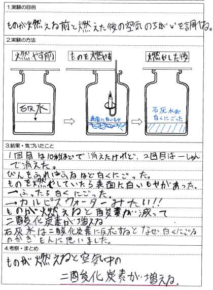 ものが燃える前と燃えた後とでは、びんの中の空気は、どのように変化しているのかについて調べました。