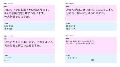 わり算の問題を考え,式と答えもそえてまとめる活動をしました。