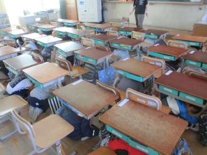 本日は、引き渡し訓練にご参加いただきありがとうございました。1年生にとっては初めてでしたが、素早く一時避難行動で机の下にもぐり、身の安全を確保することが出来ました。