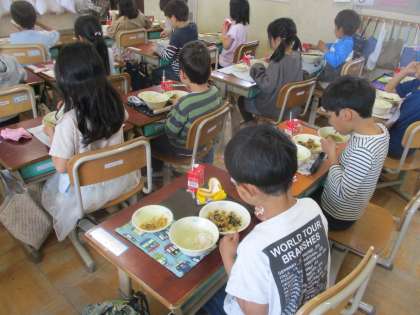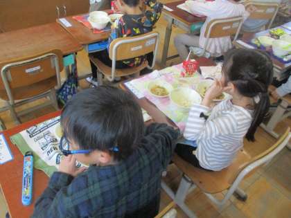 今日の給食は、新献立の「ツナと切干大根のいため煮」が出ました。切干大根のシャキシャキ食感や、あまからい味付けを楽しみました。「よく噛むとシャキシャキと聞こえるよ」と伝えると、子どもたちは「みんなで静かにしてやろう」と声をかけて耳を澄ましながらよく噛み、音を聞いていました。またおうちでも感想を聞いてあげてください。