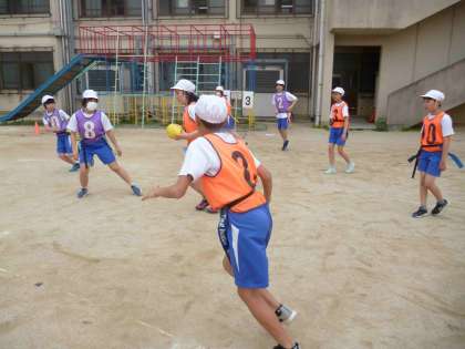タグラグビーの学習が始まりました。今日は、チームで練習をした後に試合をしました。取り組んでいるうちに、タグラグビーのルールに慣れてきたようです。