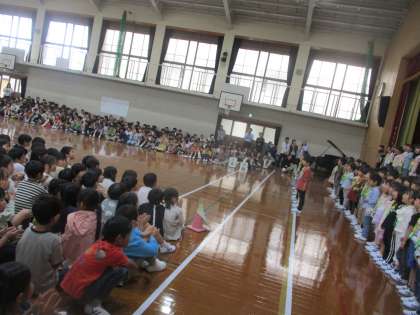 今日は1年生を迎える会を行いました。2年生から6年生がいろいろな方法で「掃除」「給食」などテーマに沿って、岩倉南のことを伝えてくれました。○×クイズや1年生への問いかけもあり、子どもたちは楽しんで見ていました。お返しのさんぽの歌は、上級生に拍手をしてみてもらうことができて、みんな張り切って頑張っていました。